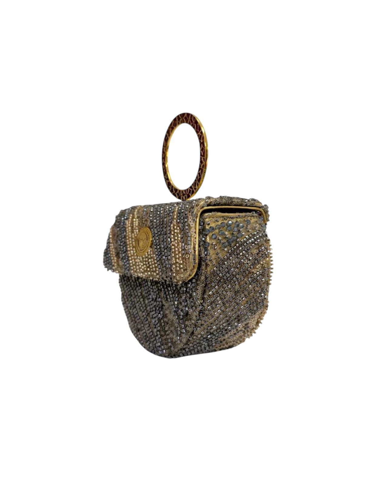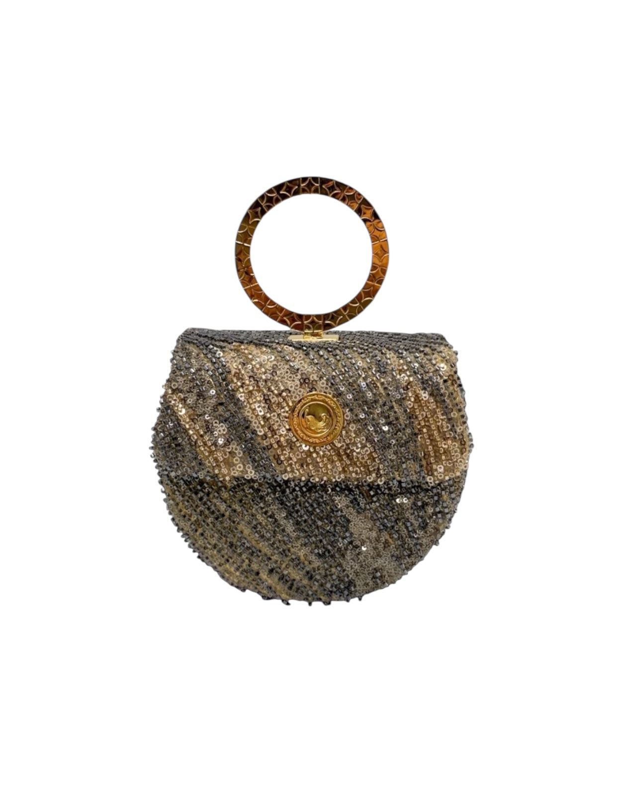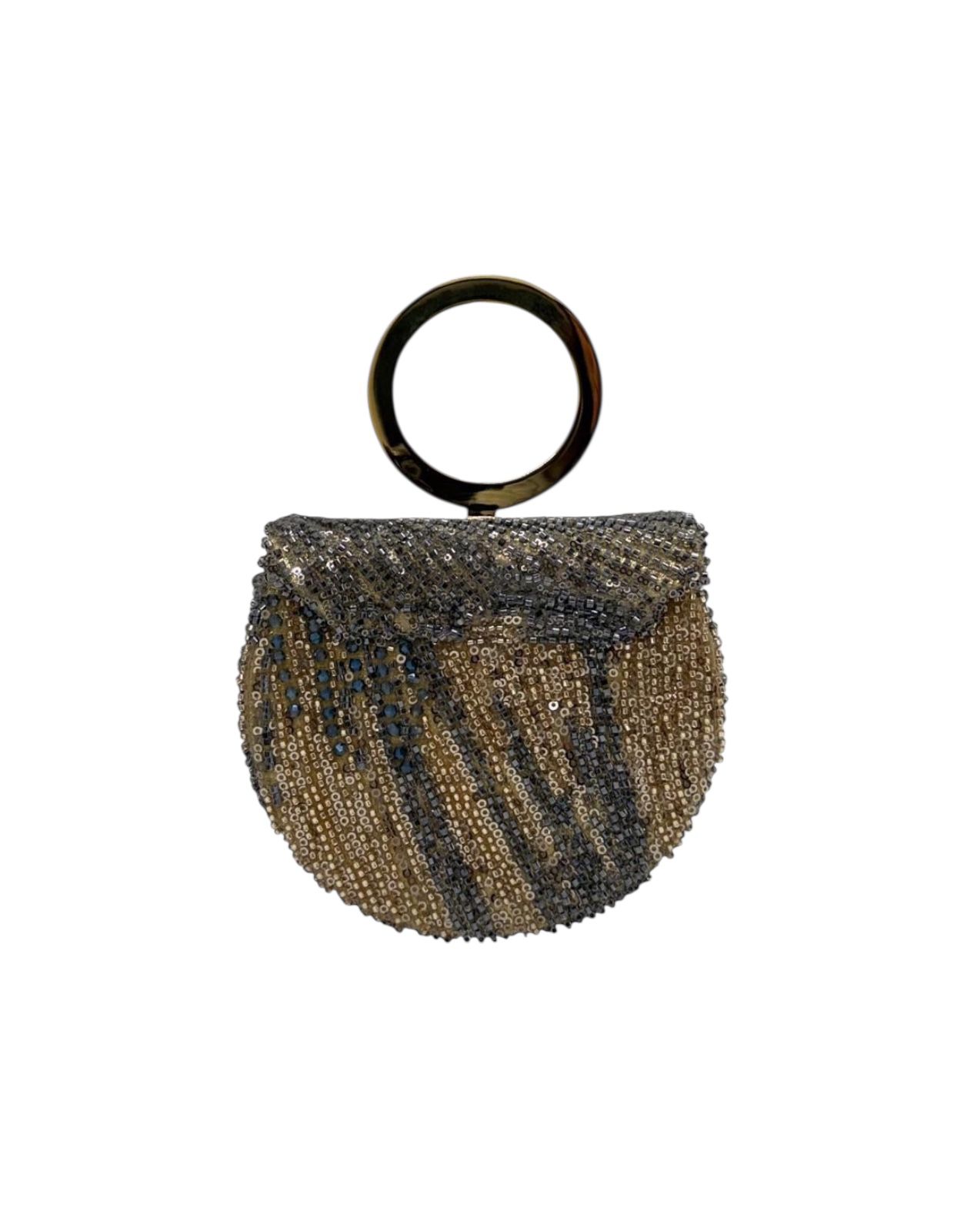 Ripples of blue and gold beads along with handcrafted gold plated brass top handle and genuine gold leather underneath to present the new midnight gold stella .